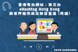 香港電台網站 : 第三台|#Hashtag Hong Kong 世界糖尿病日節目重溫 (英語) 香港電台網站 : 第三台 | #Hashtag Hong Kong 邀請本會就世界糖尿病日 (每年11月14日) 接受訪問,介紹香港糖尿聯會以提高大眾對糖尿病的認識及關注。 想重溫就本會代表副主席李俊康醫生在該節目的內容 (由於該頻度為英語,故內容為英語) 連結:https://www.rthk.hk/radio/radio3/programme/hashtaghk/episode/1060148/autoplay/archive/0