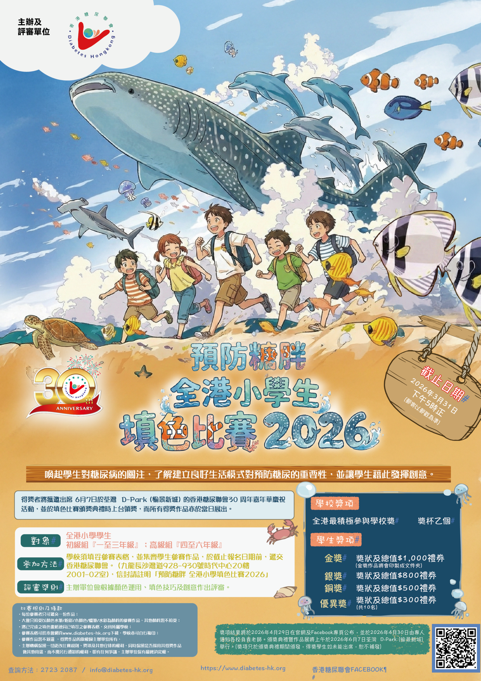 本港糖尿病患者人數年年攀升,且有年輕化趨勢。香港糖尿聯會舉辦是次「預防糖胖 全港小學填色比賽2026」,目的是希望透過填色比賽喚起學生對糖尿病的關注,了解建立良好生活模式對預防糖尿的重要性,並讓學生藉此發揮創意。