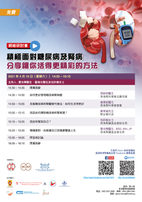 Home活動回顧積極面對糖尿病及腎病 分享讓你活得精彩的方法 (網絡研討會) 積極面對糖尿病及腎病 分享讓你活得精彩的方法網上研討會 積極面對糖尿病及腎病 分享讓你活得精彩的方法 網上研討會 2021年4月10日 (星期六) 下午2時30分 至 4時10分 費用:全免 形式:網上直播 Zoom: http://bit.ly/3rWSesD Facebook Live: https://www.facebook.com/hkkf1979 (香港腎臟基金會)