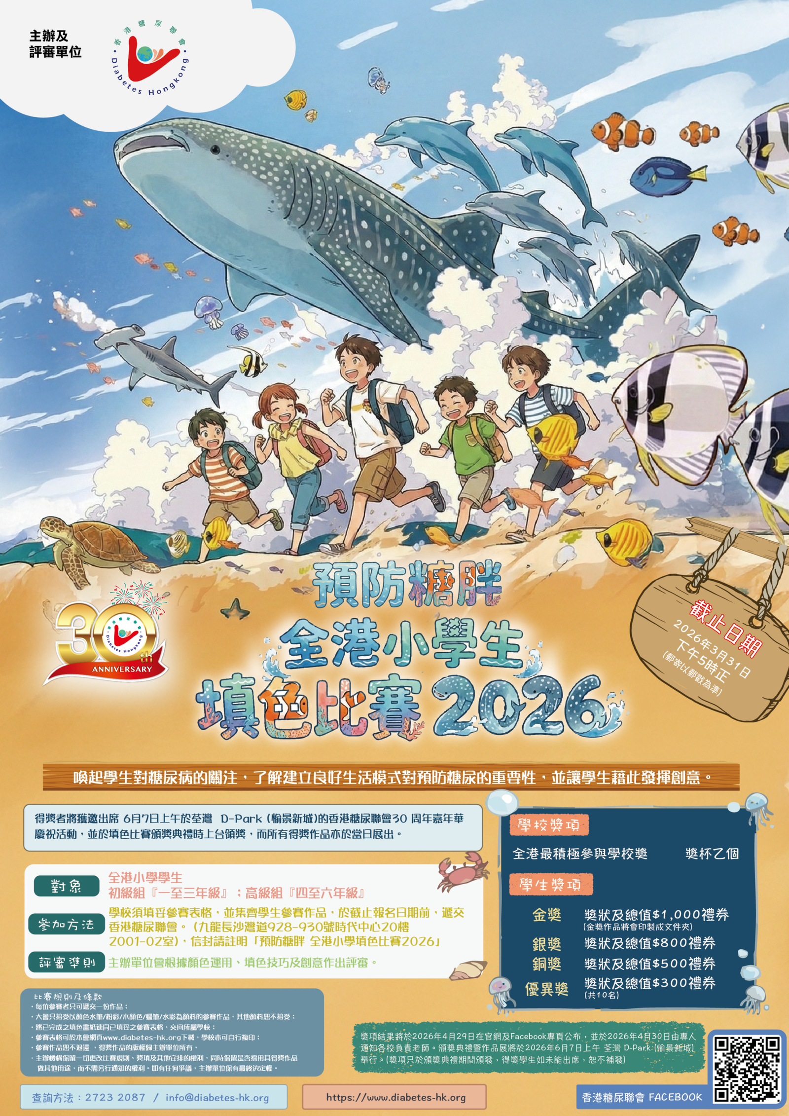 本港糖尿病患者人數年年攀升,且有年輕化趨勢。香港糖尿聯會舉辦是次「預防糖尿 全港小學填色比賽2026」,目的是希望透過填色比賽喚起學生對糖尿病的關注,了解建立良好生活模式對預防糖尿的重要性,並讓學生藉此發揮創意。